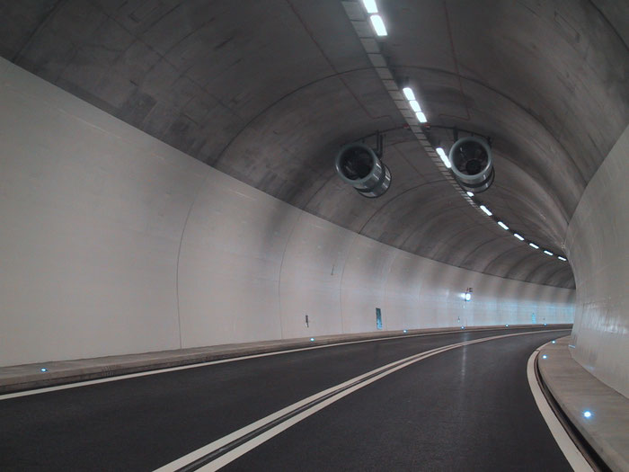 The ventilation system consists of longitudinal ventilation with mid-point extraction. A local smoke extraction system with controllable dampers is installed for emergency ventilation. The airflow along the carriageway can be actively controlled with jet fans. The safety tunnel has a pressurisation system to keep it smoke-free.